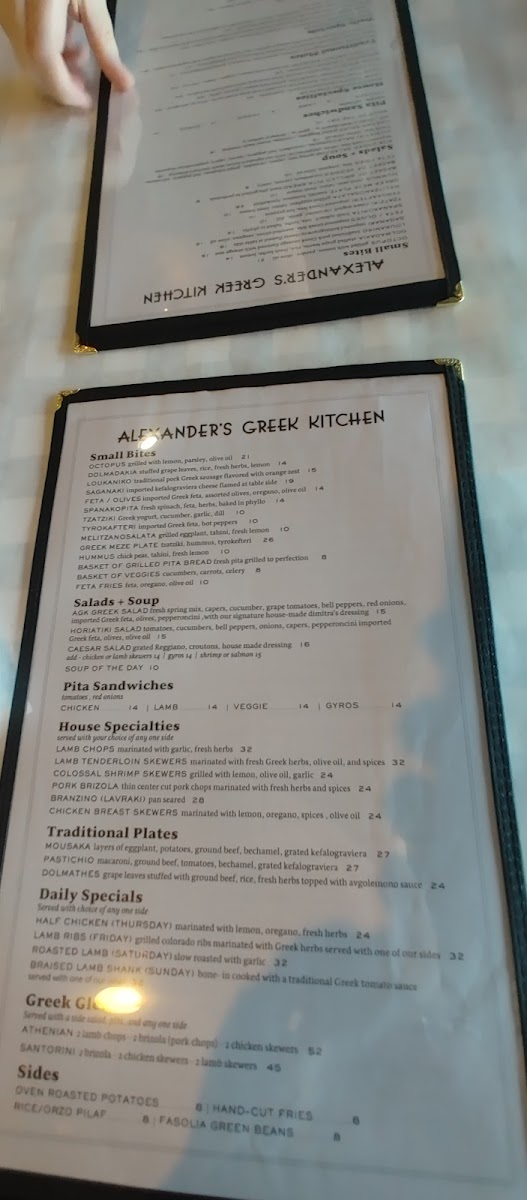 This menu, with a blend of traditional and modern Greek dishes, is designed to satisfy every palate. Whether you're in the mood for a quick bite or a leisurely meal, Alexander's Greek Kitchen promises a memorable dining experience with bold flavors and authentic ingredients.